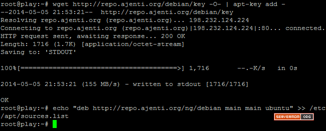 wget http://repo.ajenti.org/debian/key -O- | apt-key add - echo "deb http://repo.ajenti.org/ng/debian main main" >> /etc/apt/sources.list